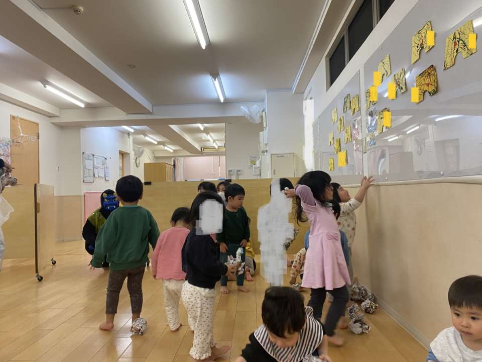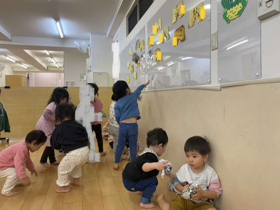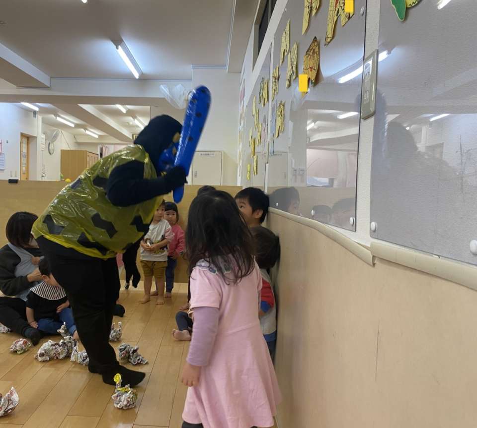 おやつ後の帰りの会で子どもたちにリクエストいただき節分の絵本を読んでチラシを丸めて作った豆を鬼の壁面に「おにはそと!」とはりきって練習していました。