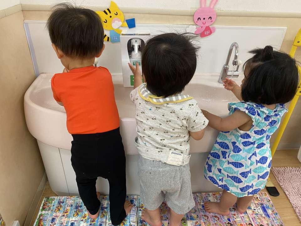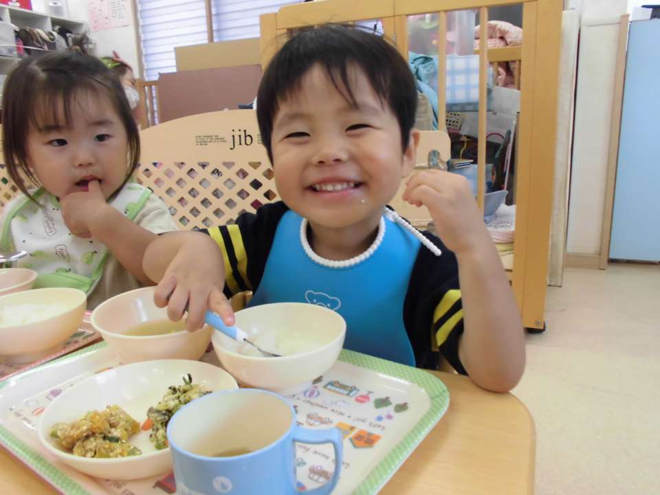 お散歩から帰ったら手洗いをして着替えてトイレに行くお友達、おむつ替えをするお友達。栄養士さんが毎日一生懸命作ってくれる手作り給食がみんなとっても楽しみです!