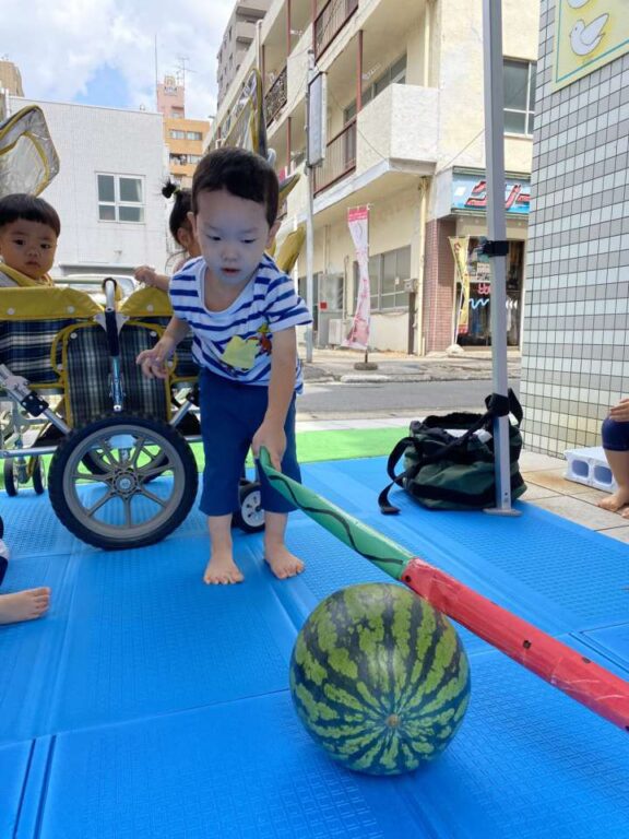 夏のイベント、スイカ割りを行いました🍉 いちご組さんは、去年も行ったからか、とても上手に棒を持ち力いっぱいスイカを叩いていましたよ 😊 お友達が叩いていると「がんばれ♪がんばれ♪」と応援してあげています! ぶど […]