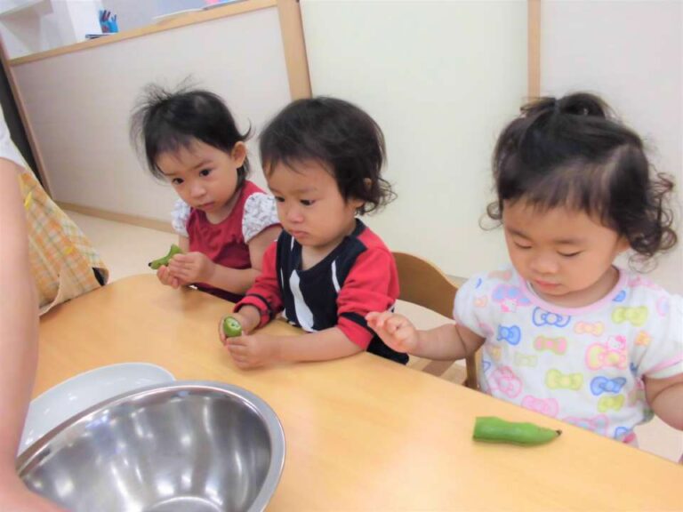 この日はみんなで給食のそら豆を剥きました! そら豆の大きな鞘に興味津々✨ 一粒ずつ、そぉっと取り出します。 真剣なまなざし…🤫✨ 取れた!思わず笑みがこぼれます☺️ さっそく茹でたてをいただきます! 新鮮でおいしいね😍