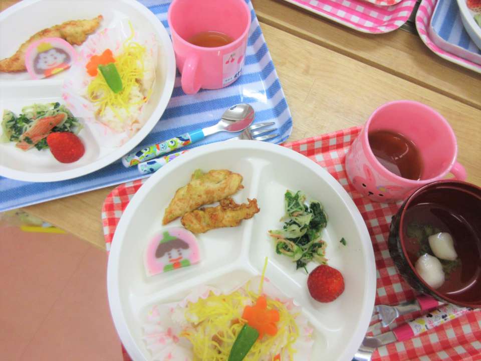 おひなさま給食 2019年4月3日 最終更新日時 : 2025年12月11日 roomcutie お雛様とお内裏様が乗った可愛いお給食♪ 🎎 みーつけた!みんなニコニコ顔で食べました😊 この日はおやつもスペシャルおやつ😋 お雛様ケーキとひなあられを パクリ! みんなで美味しく食べました❤️ 一緒に働くみなさんを募集しています 面接前の見学大歓迎です 保育ルームキューティーでは、一緒に働く保育士・栄養士・調理員・看護師・准看護師の方を募集しています。扶養内で働きたい、週4日以内で働きたい、これから保育士を目指しているなどのご要望もご相談ください。 採用情報はこちら