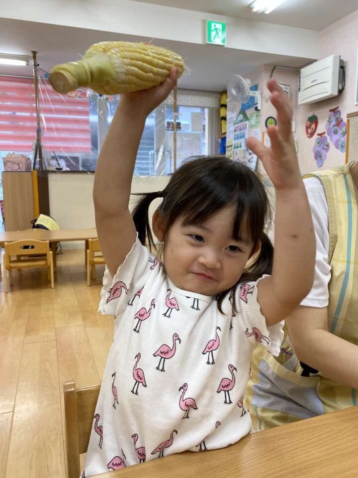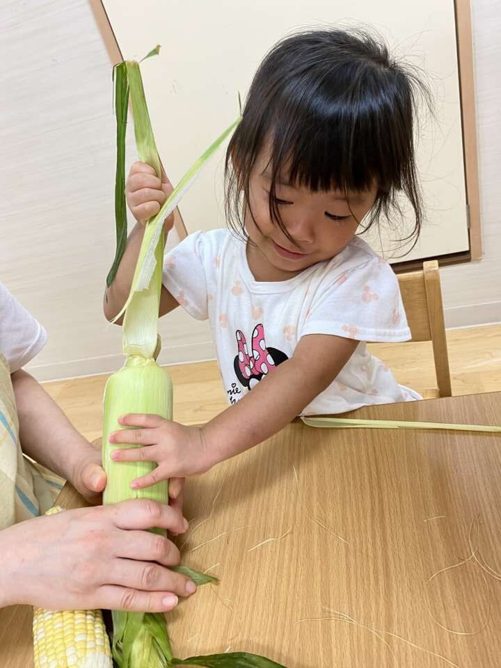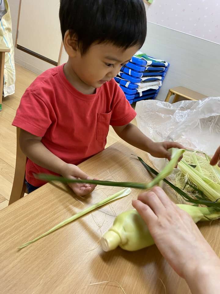 また別の日は2歳児のお友だちがおやつに使うトウモロコシの皮やひげを取るお手伝いをしてくれました🌽