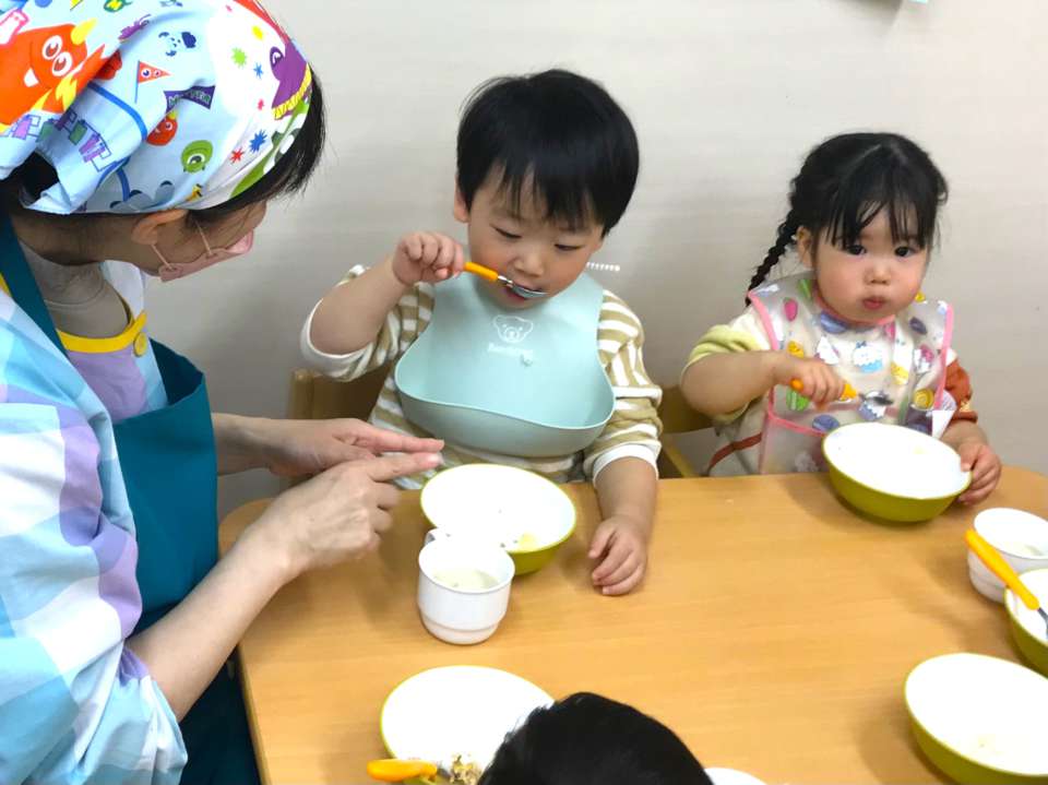 先生方は子どもたちに色々な声かけをしながら「自分から食べてみよう」という気持ちを応援しています。