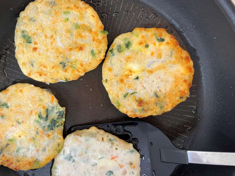 ③フライパンに油(材料記載外)をひき生地を丸く広げて両面を焼きます。