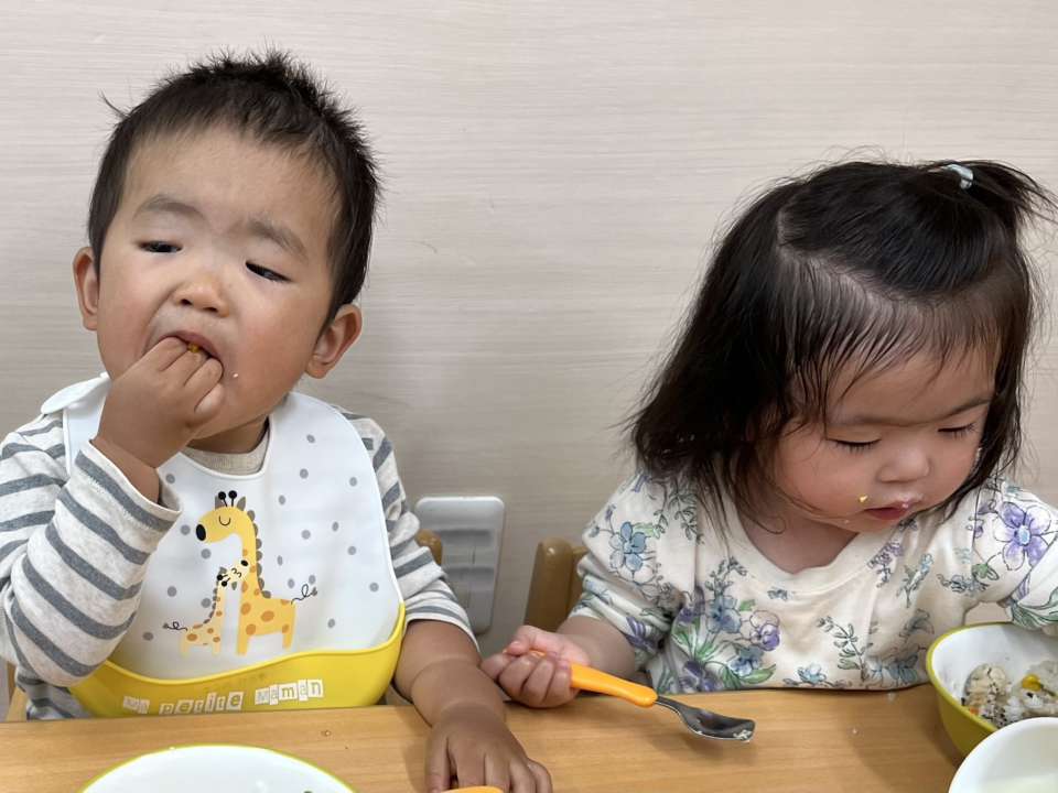 いつもと違うお皿やスプーン、家で食べているごはんと違うことに、とまどっている姿もみられました。