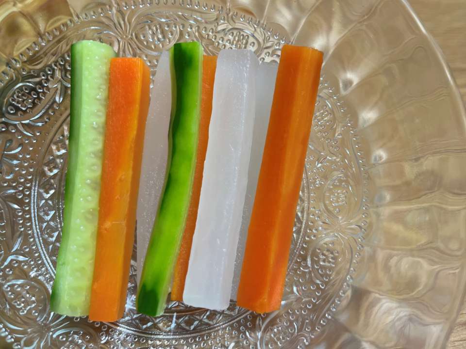 〇子どもがにぎった手から少し出る長さのスティック茹で野菜は前歯でかじりとる練習になります。また、あえて同じ大きさに切りそろえずに、色々な形にしてみるもの楽しいですね。