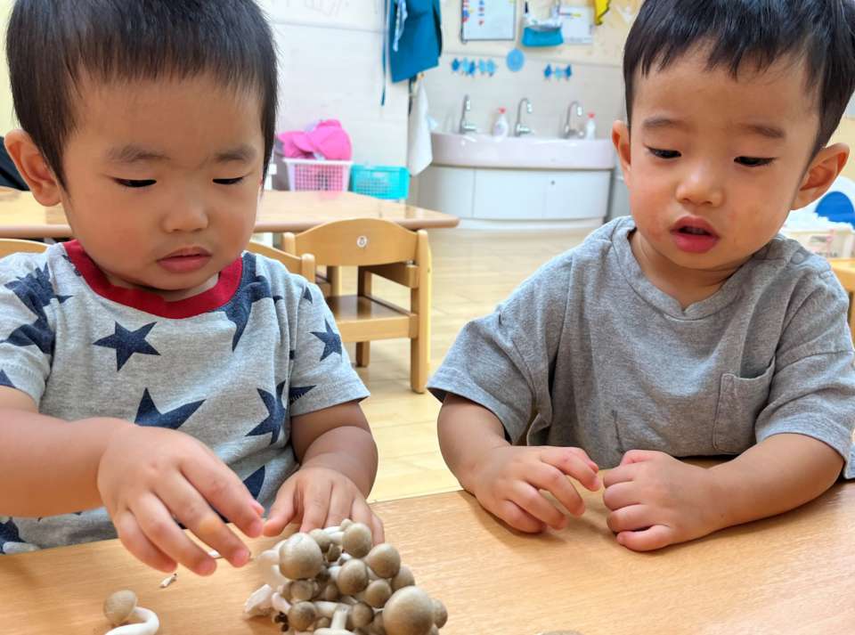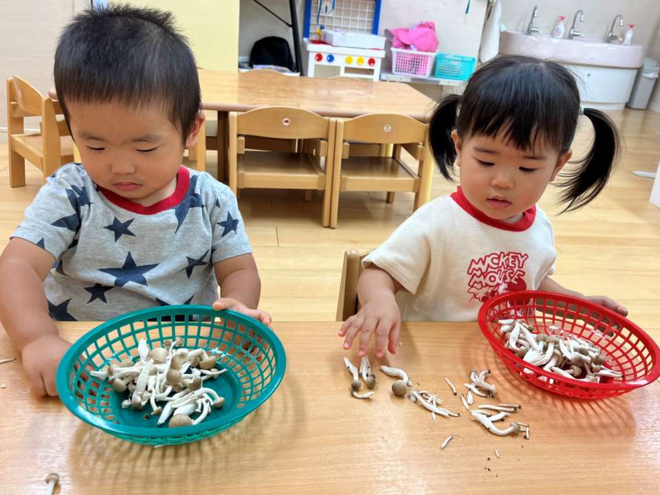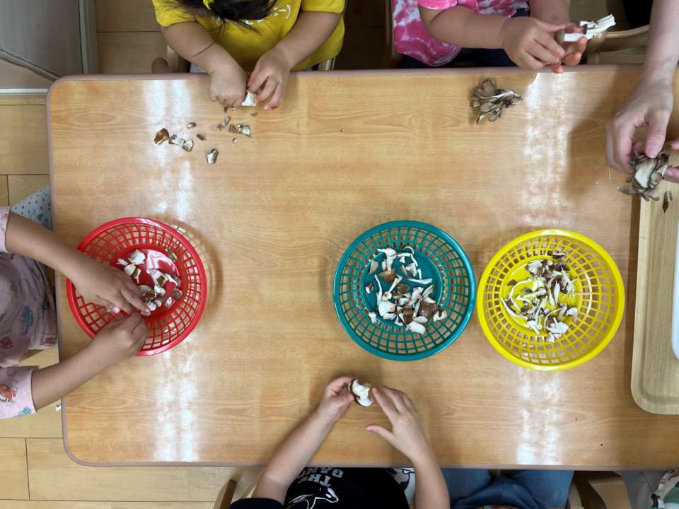 園で行う「きのこほぐし🍄」などの食材の下ごしらえのお手伝いは、みんなで食べる給食の材料なので、自分だけではなく、友達もその食材に関わっています。