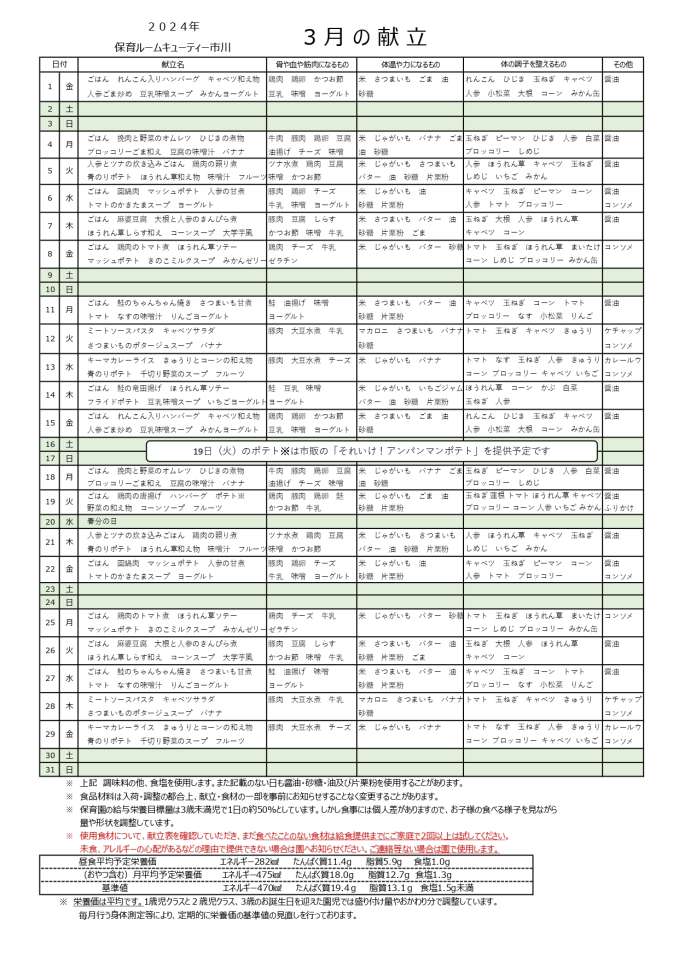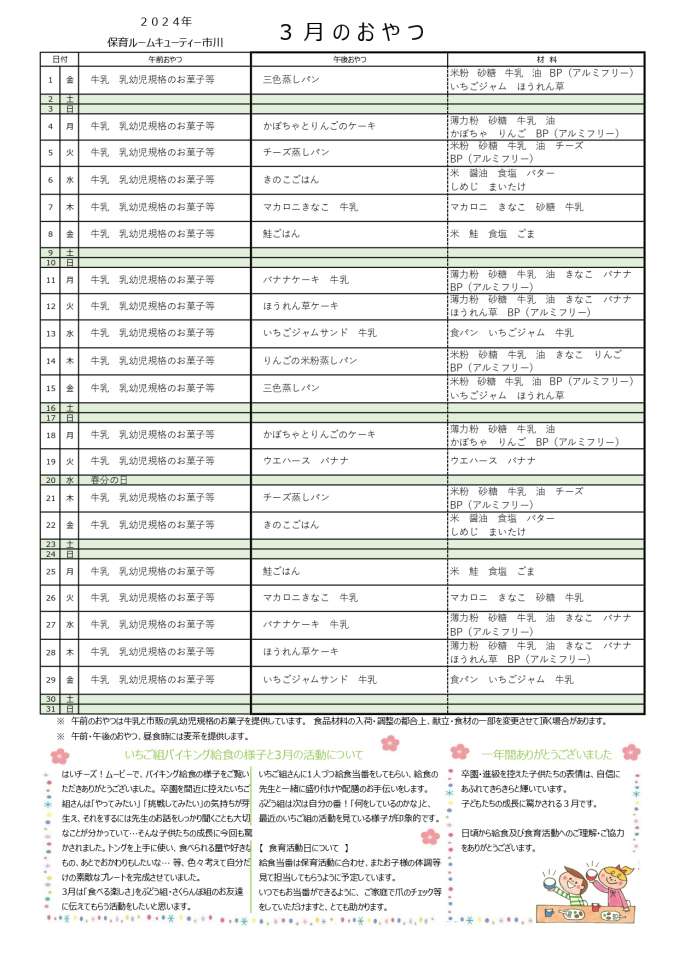 2024年3月の給食とおやつの献立表(市川園)です⇩