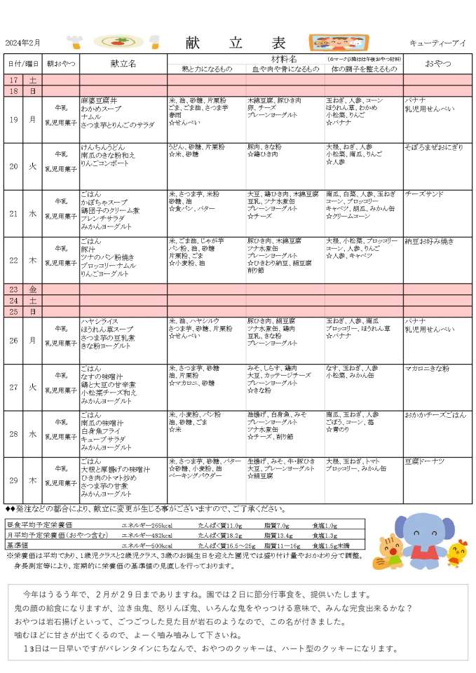 最後にキューティーアイの献立表もご紹介♪